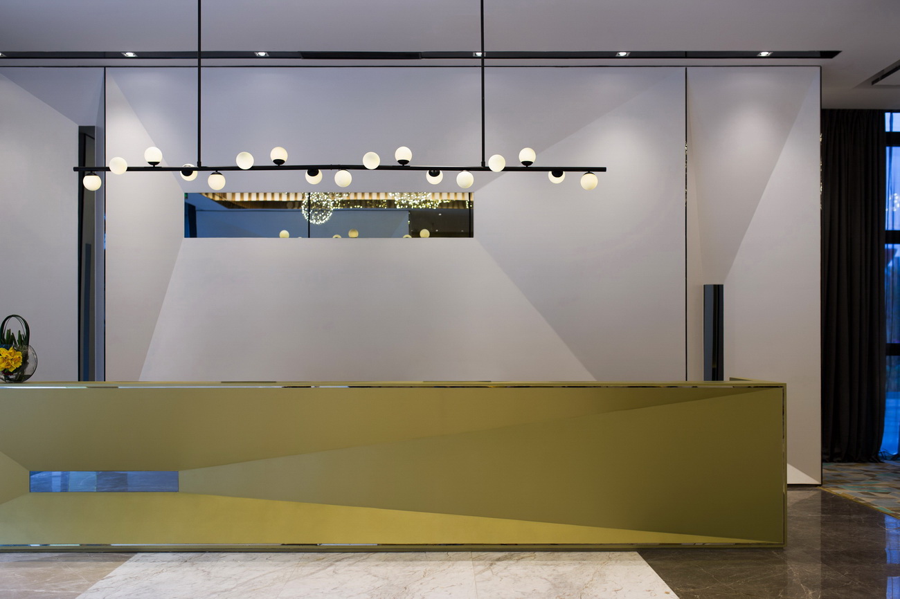 本案布局主要分為上下兩層,一樓為前臺接待區(qū)、模型區(qū)、洽談區(qū)、吧臺、VIP室及辦公室;二樓則包括VIP洽談室及銀行簽約區(qū)。